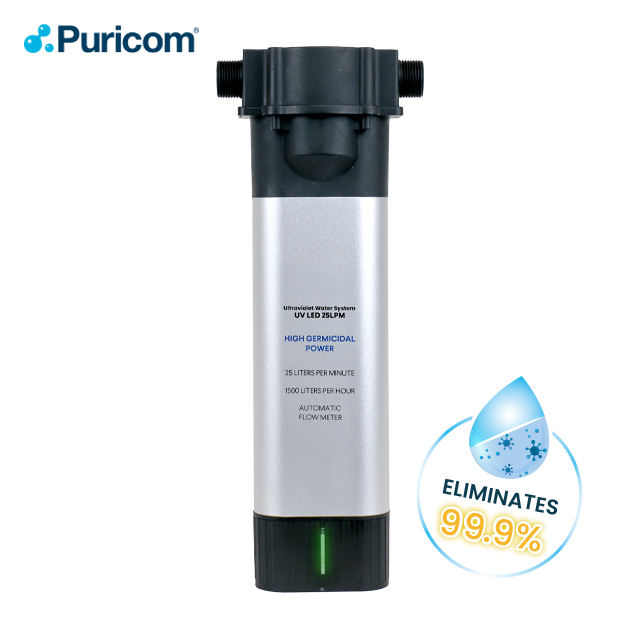 หลอดไฟกรองน้ำยูวีแอลอีดีสำหรับบ้านทั้งหลัง ยี่ห้อ PURICOM ได้รับการรับรองมาตรฐาน CE/RoHS ใช้ไฟฟ้ากระแสตรง 24 โวลต์ 25 ลิตร/นาที 23 วัตต์ ผลิตในไต้หวัน