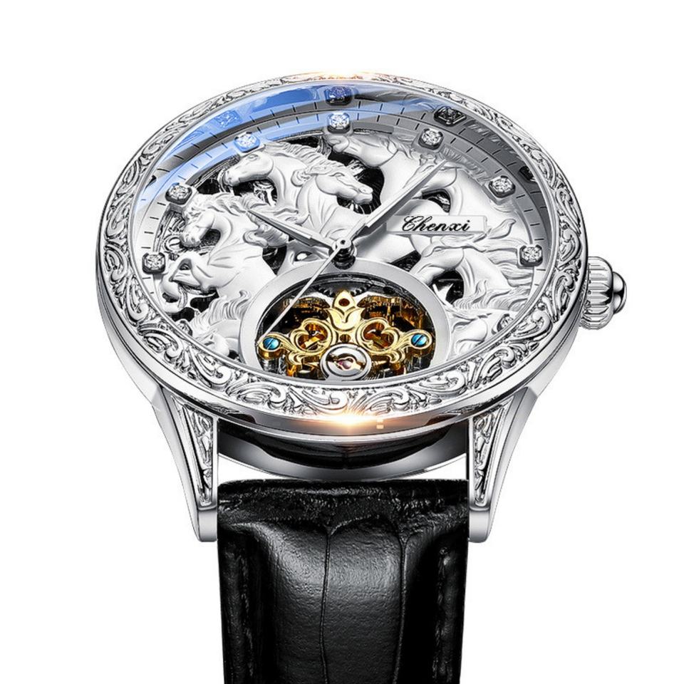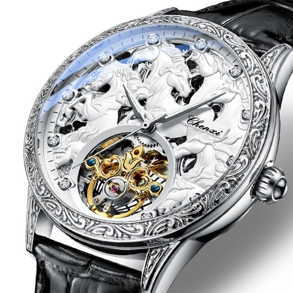 CEHNXI 6029 นาฬิกาข้อมือผู้ชายหนังแท้ รุ่นลิมิเต็ดอิดิชั่น ระบบออโตเมติก โชว์กลไก พร้อมฟังก์ชั่นเรืองแสง กันน้ำ ดีไซน์ล้อหมุน แปดม้า ขายดี
