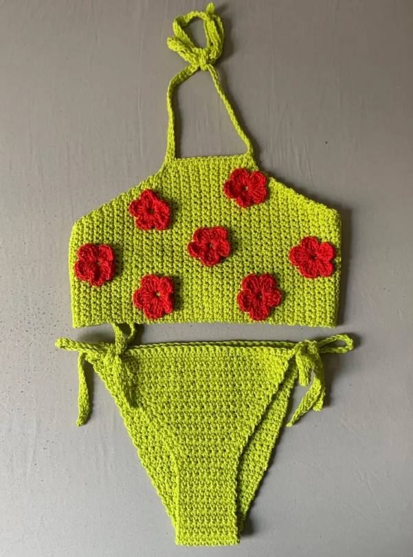 กางเกงบิกินี่ทรงสามเหลี่ยมเอวสูงแบบผูกเชือกด้านข้าง รุ่น CHEEKY ถักโครเชต์ สายรัดปรับได้