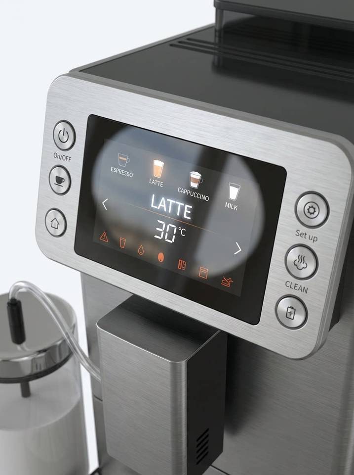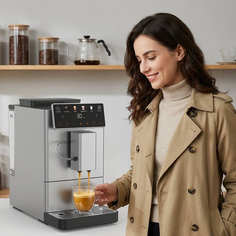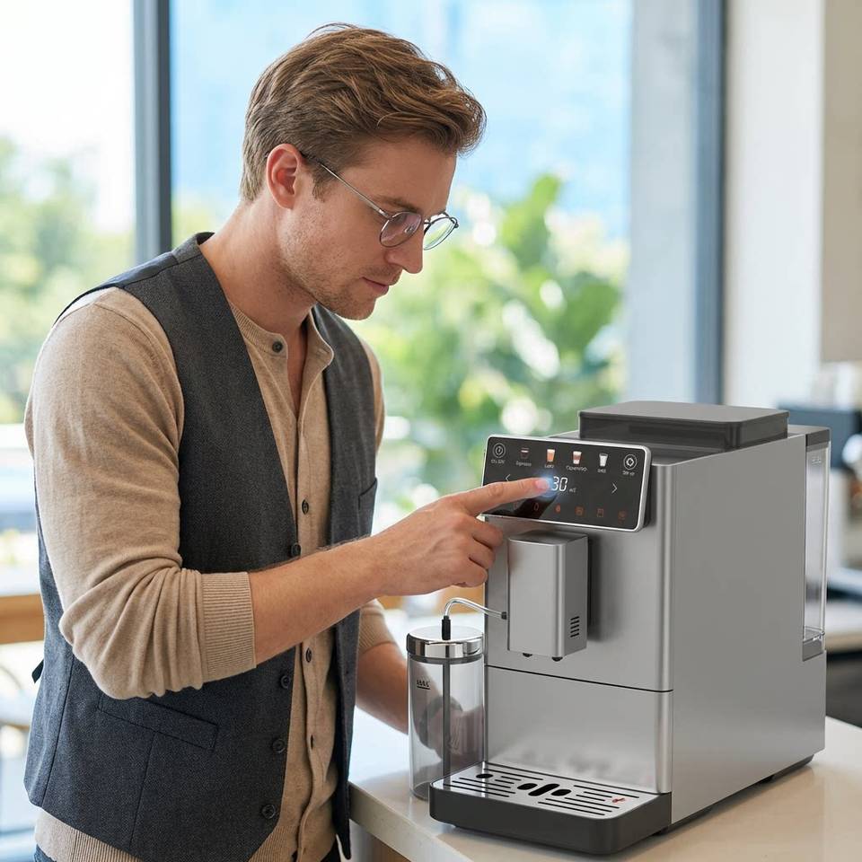 เครื่องชงกาแฟเอสเพรสโซ่กึ่งอัตโนมัติ CM03-A สมาร์ทดิจิตอลโฮมมิลค์จั๊ก แบบหม้อต้มคู่ ได้รับการรับรองมาตรฐาน CE โครงสร้างโลหะ แรงดัน 20 บาร์ พร้อมเครื่องบดในตัว ความจุ 40 ออนซ์
