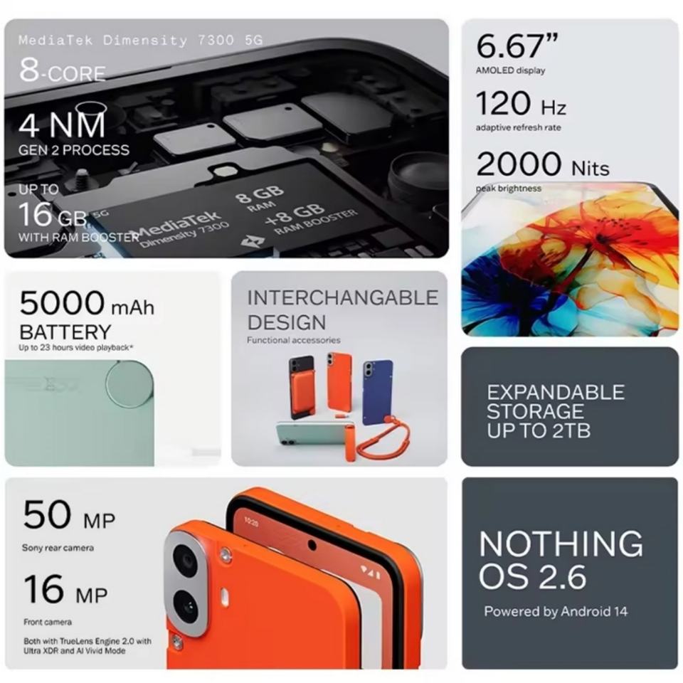 โทรศัพท์ CMF 1 5000มิลลิแอมป์ OCTA Core 5G สมาร์ทโฟนพร้อม6.67 "หน้าจอ Super AMOLED 120Hz แรม8GB และ256GB ROM LTE Cellular