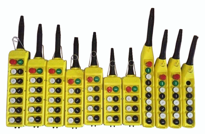 รอกยกพลาสติกสีเหลือง CMK แบบควบคุมความเร็วสองระดับสำหรับเครน EOT ระดับ IP65 พร้อมปุ่มหยุดฉุกเฉิน 2-14 ปุ่ม ผลิตในอินเดีย