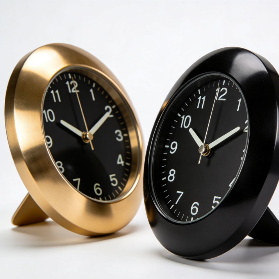 นาฬิกาตั้งโต๊ะสไตล์มินิมอล ผลิตด้วยเครื่อง CNC และลวด EDM ได้รับการรับรองมาตรฐาน ISO9001 ผลิตจากสแตนเลสขัดเงา/สีดำ ดีไซน์เรียบหรูสำหรับตกแต่งโต๊ะ