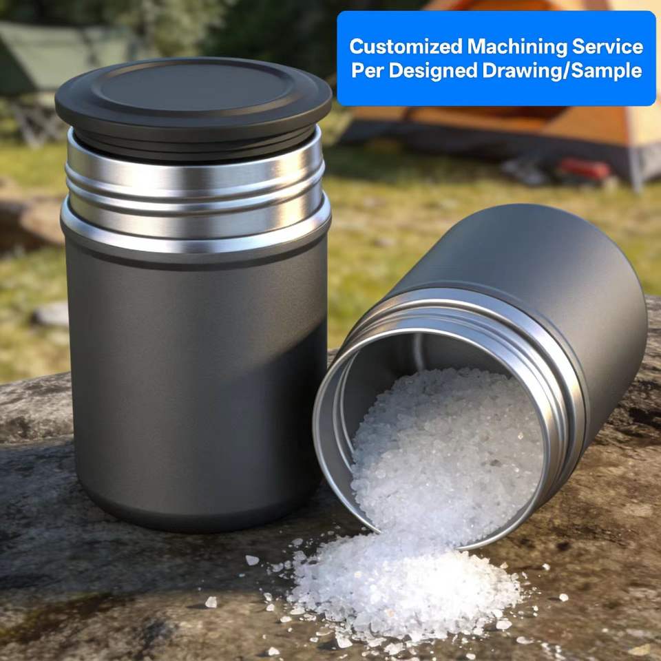 บริการงานกลึง CNC กล่องใส่เครื่องเทศ กล่องเกลือแบบกำหนดเอง กล่องเก็บของ 4 ช่องทรงกลม กล่องเก็บของสำหรับแคมป์ปิ้ง กล่องเครื่องเทศสแตนเลส