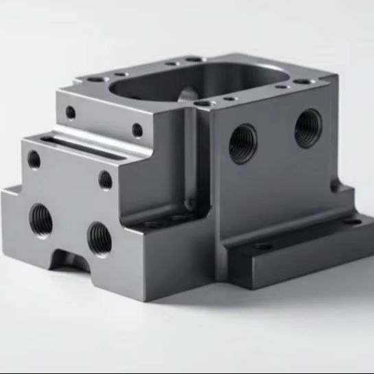 CNC-machined housing manifold block typically used as a valve body or precision machine housing