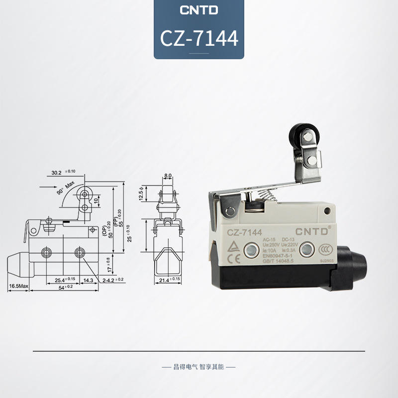 สวิตช์ไมโครไฟฟ้า CNTD Changde CZ-7144 กันน้ำ หน้าสัมผัสเงิน แบบลูกกลิ้ง รีเซ็ตอัตโนมัติ รองรับแรงกดสูงสุด แรงดันไฟฟ้า 220 โวลต์