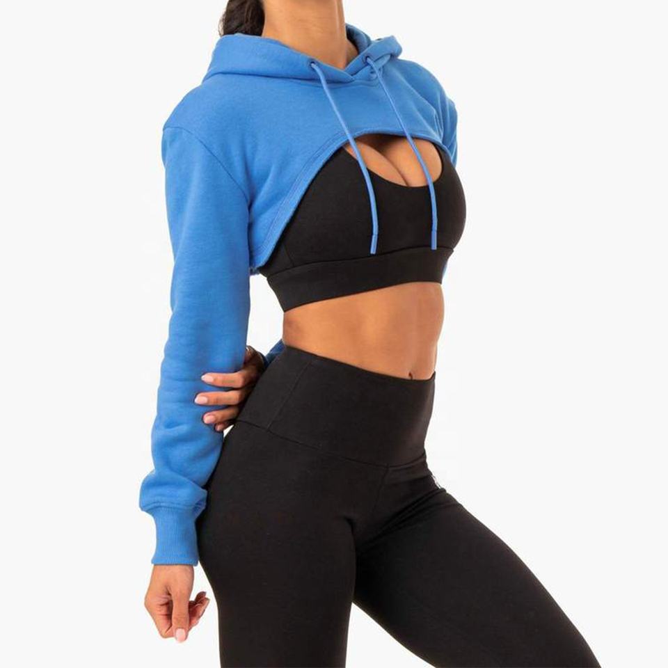 เสื้อครอปฮู้ดดี้แขนยาวสำหรับผู้หญิง ตัดเย็บแบบขาดๆ แต่งลายปักโลโก้ เหมาะสำหรับออกกำลังกายที่ยิม