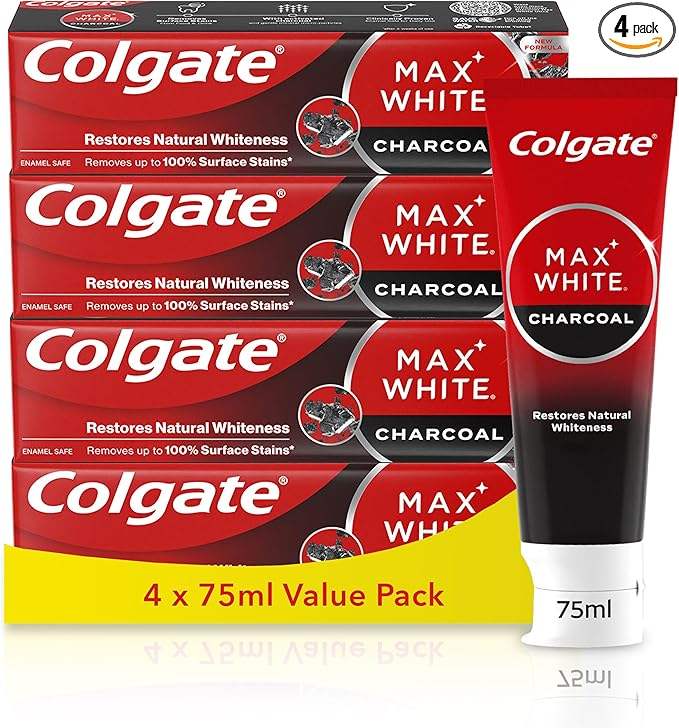 ยาสีฟันแม็กซ์ไวท์ชาร์โคล 4x75 มล. สูตรที่ผ่านการพิสูจน์ทางคลินิก ช่วยขจัดคราบ ปกป้องฟันที่บอบบาง ด้วยสารสกัดจากพืช