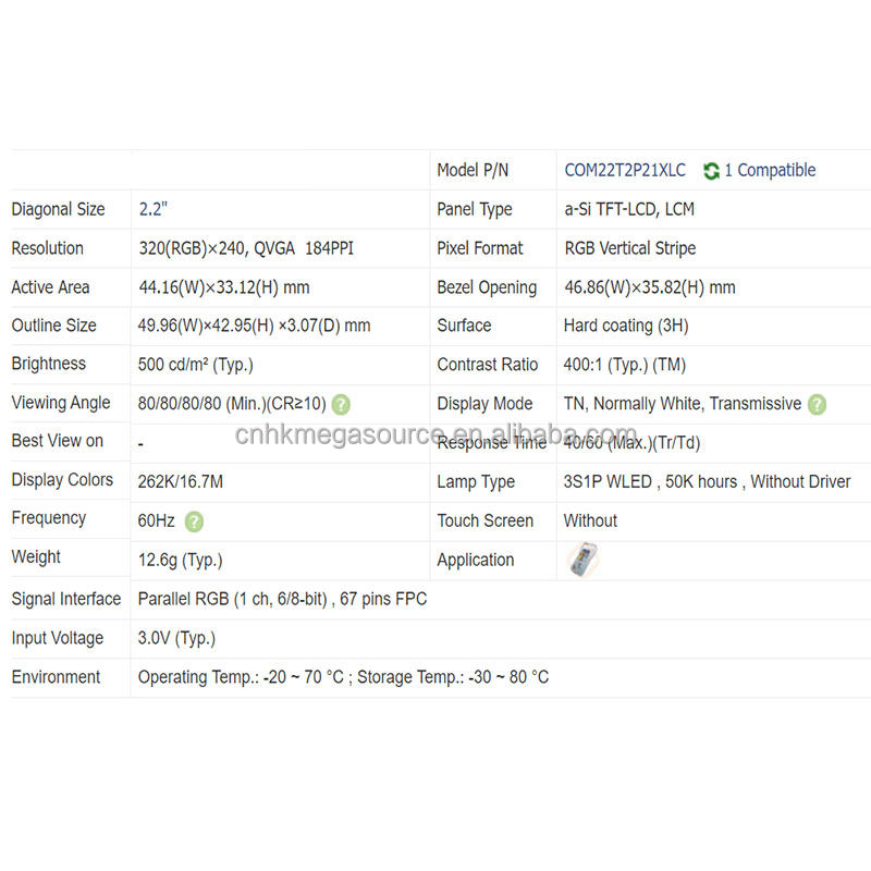 จอแสดงผล LCD รุ่น COM22T2P21XLC ของใหม่ 100% ขนาด 2.2 นิ้ว ความละเอียด 320*240 พร้อมจัดส่ง
