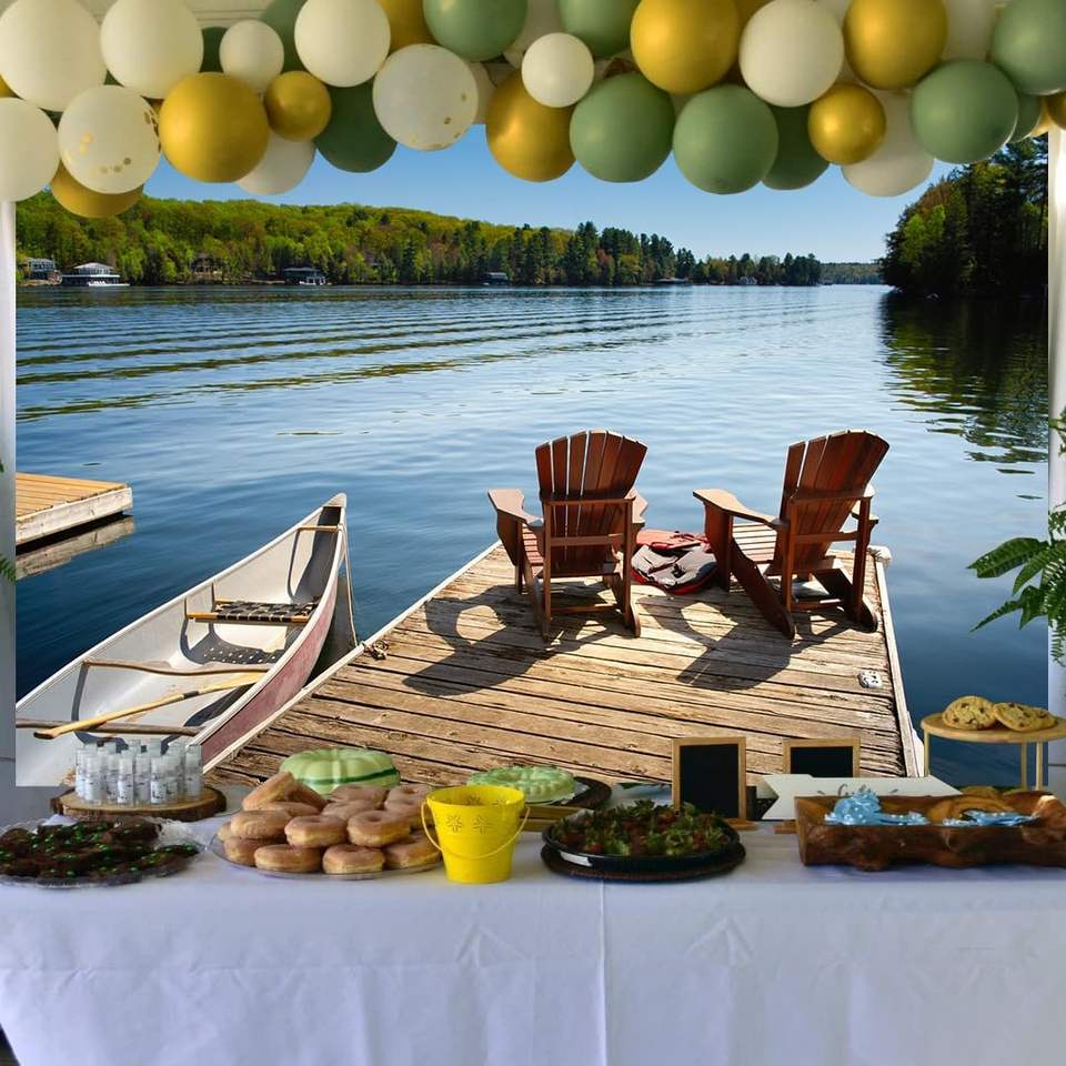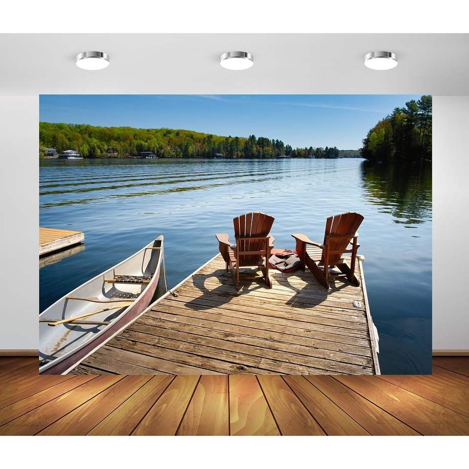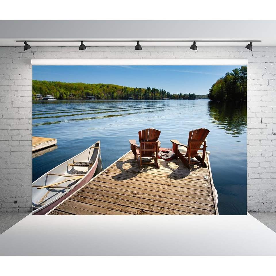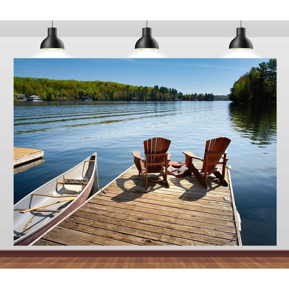 ฉากหลังตกแต่งผนัง CORFOTO ขนาด 7x5 ฟุต ลายป่าเขียว ริมทะเลสาบ แม่น้ำ ทิวทัศน์ธรรมชาติ เรือแคนู ท่าเทียบเรือไม้ ล้างทำความสะอาดด้วยเครื่องได้