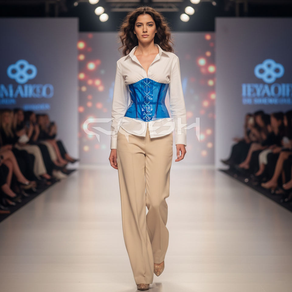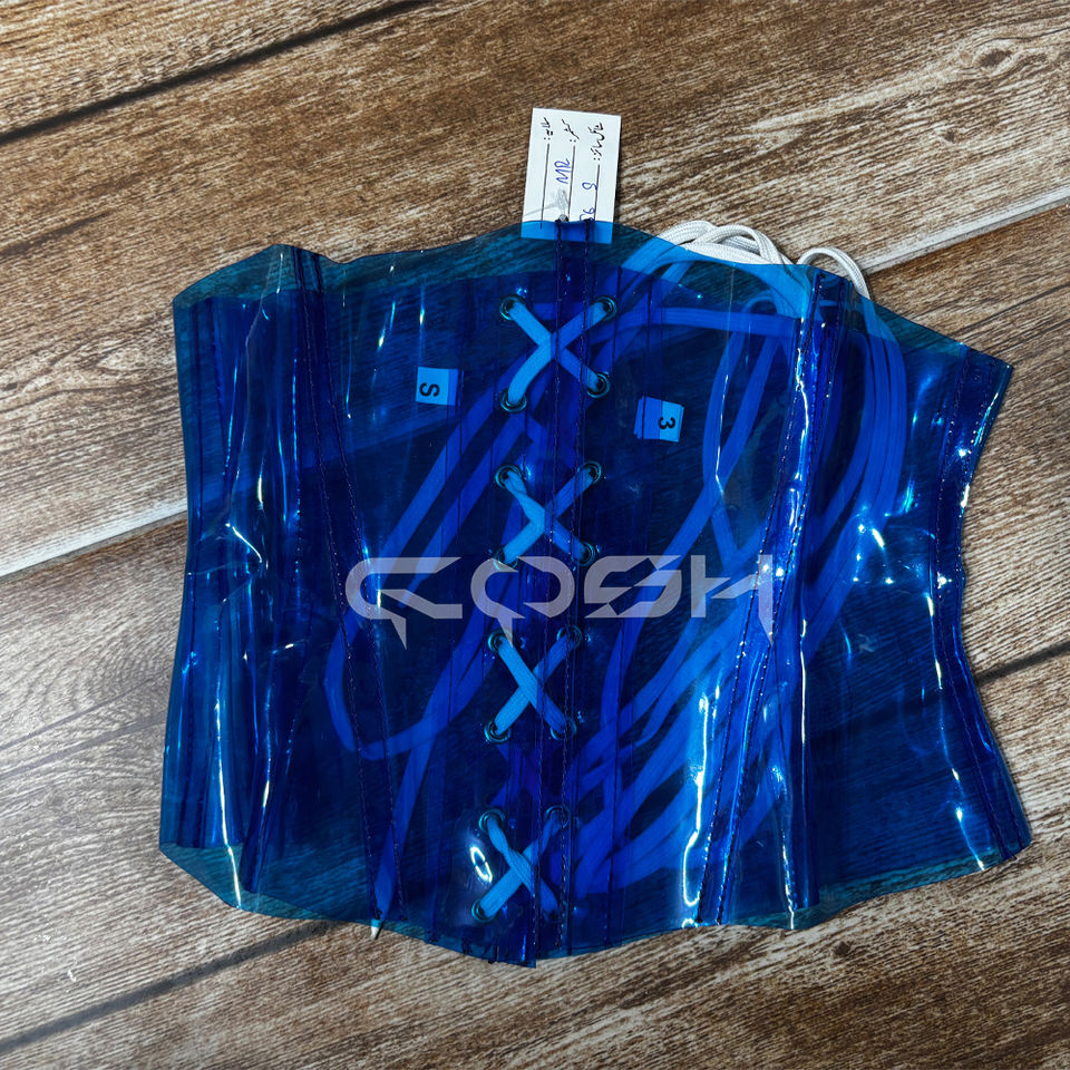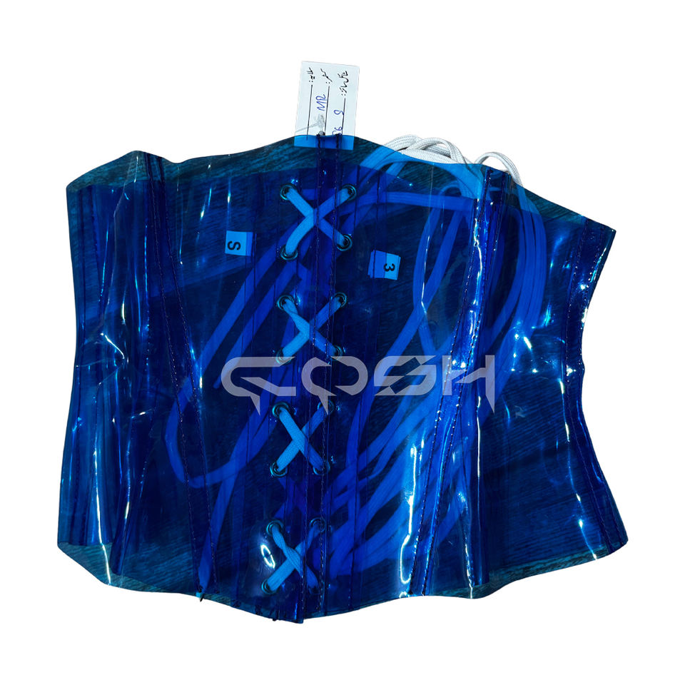 คอร์เซ็ท COSH แบบใส สีฟ้า ผลิตจากไวนิล PVC แบบรัดเอวใต้หน้าอก คอร์เซ็ททรงวัสปี้ รับผลิตแบบ OEM/ODM ผู้ผลิตคอร์เซ็ทตามสั่ง