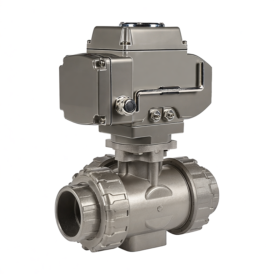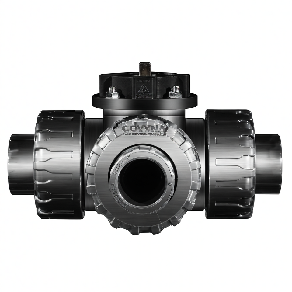 วาล์วบอลไฟฟ้าพีวีซีแบบ 3 ทาง ยี่ห้อ COVNA วาล์วบอลไฟฟ้าพลาสติก วาล์วบอลไฟฟ้ายูพีวีซีแบบยูเนี่ยนคู่