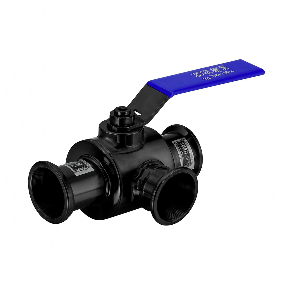 วาล์วบอลสุขภัณฑ์สเตนเลสสตีลเกรดอาหาร 316 แบบ 3 ทาง ขนาด DN20 3/4 นิ้ว พร้อมข้อต่อแบบ Tri Clamp และคันโยก