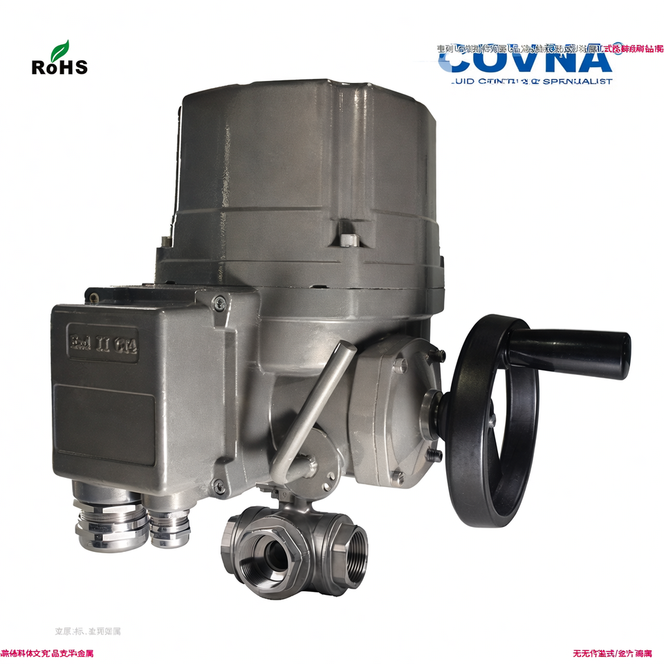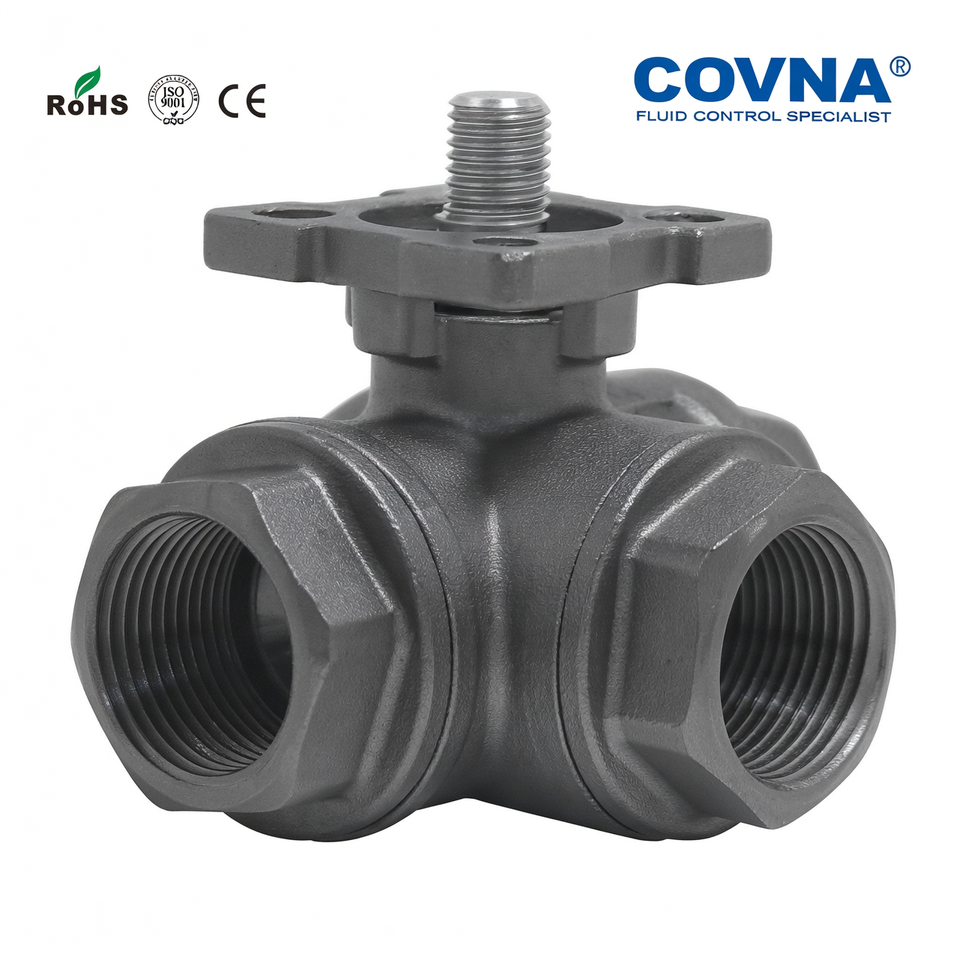 วาล์วบอลไฟฟ้าแบบขับเคลื่อนด้วยไฟฟ้า COVNA DN20 3/4 นิ้ว 3 ทาง แบบ T พอร์ต 1000 WOG 24 โวลต์ เกลียวใน ทำจากสแตนเลส CF8M