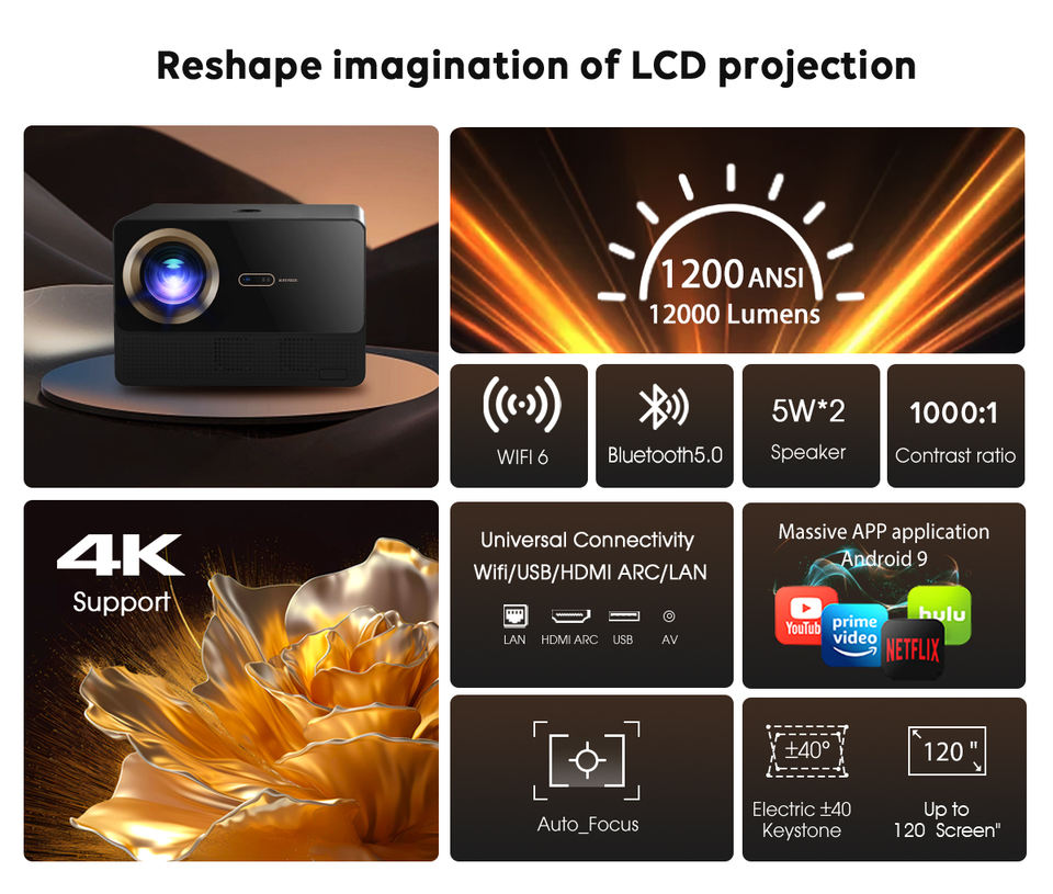 CR67โปรเจคเตอร์กลางแจ้งเคลื่อนที่ได้สูงสุด4K Android 11มีลำโพงในตัวบีมเมอร์สเตอริโอ Hi-Fi สเตอริโอแบบพกพาสำหรับธุรกิจและการศึกษา