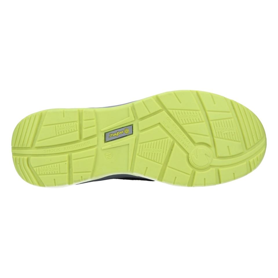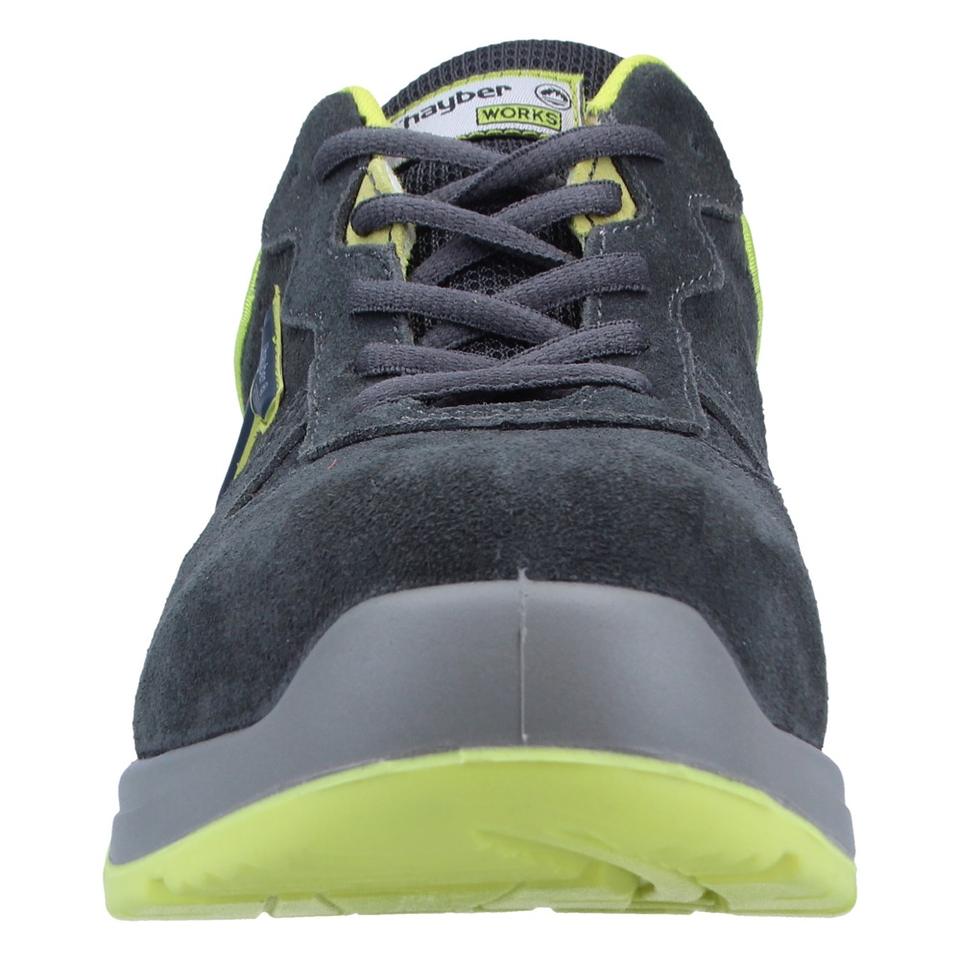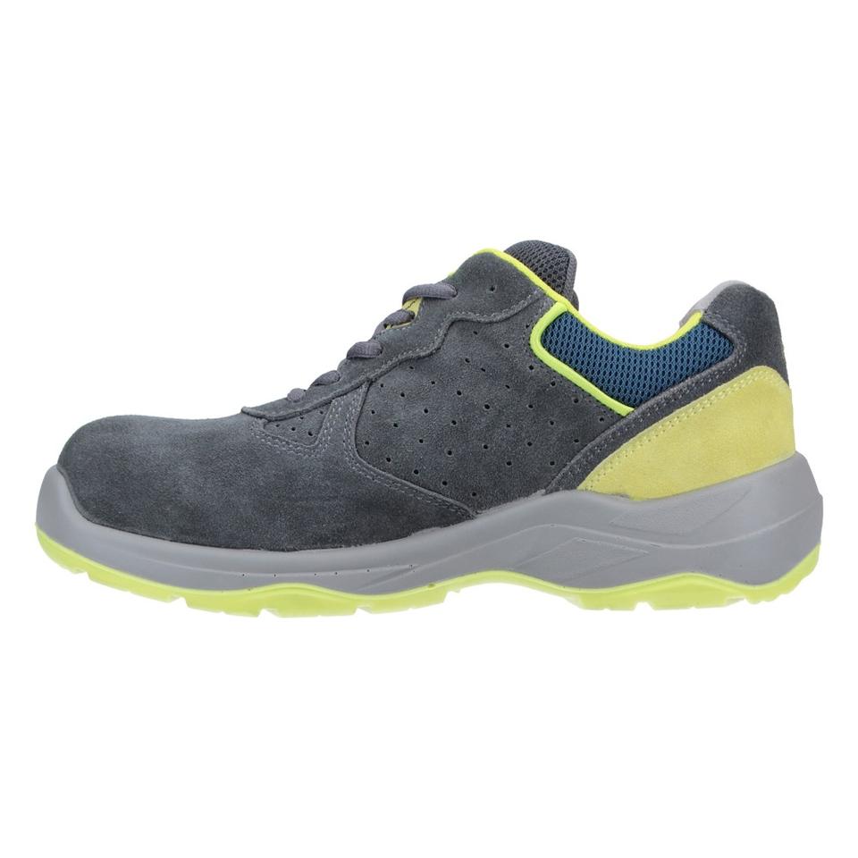 Cromo S1PS Fo SR รองเท้านิรภัยสีเทายืดหยุ่นน้ำหนักเบามีรายละเอียดสีเขียวมะนาวพื้นในรองเท้าหนังวัวระบายอากาศได้ดี