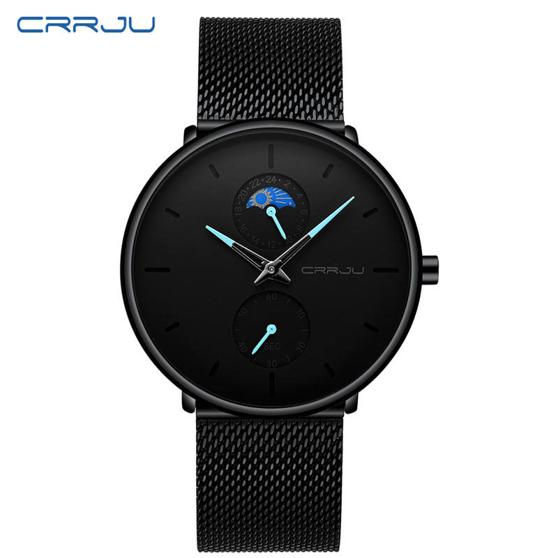 CRRJU บุรุษอัลลอยด์กระจกกันน้ำควอตซ์นาฬิกา 42 มม.มินิมอลลิสต์สายมิลานีสต์ ตัวชี้ ฟีสพระจันทร์สำหรับผู้ชายธุรกิจกีฬาของขวัญ
