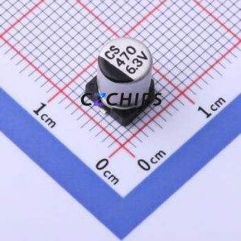 ตัวเก็บประจุแบบอิเล็กโทรไลต์อะลูมิเนียม SMD รุ่น CS0J471M-CRE77 ขนาด D6.3xL7.7 มม. ความจุ 470uF 20% แรงดัน 6.3V กระแสไฟ 120mA ความถี่ 120Hz