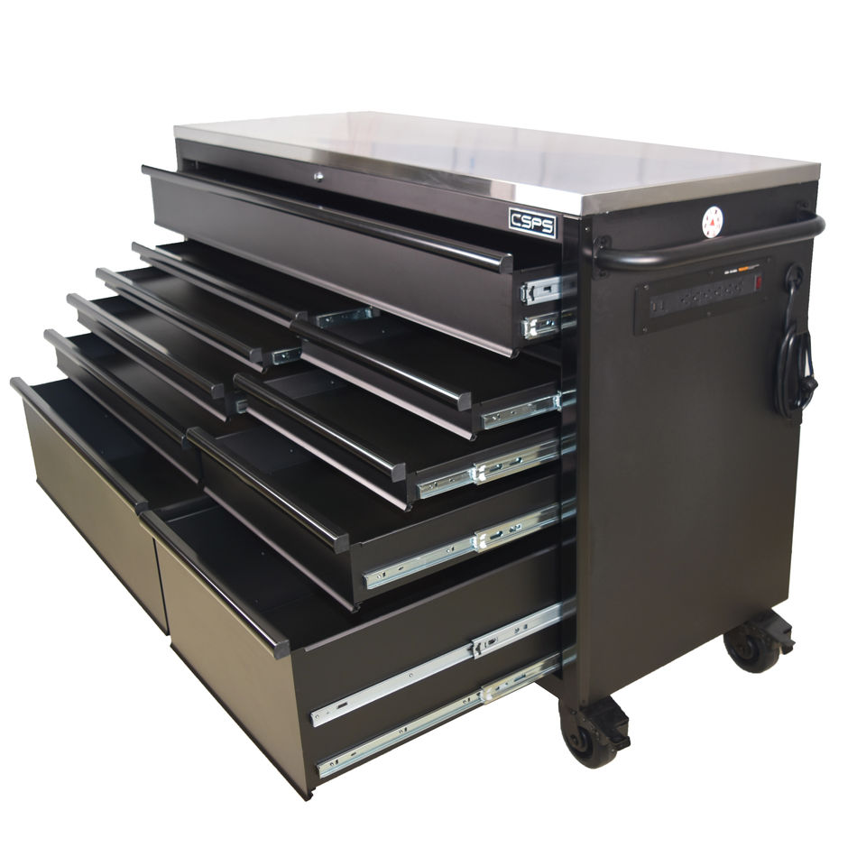 ตู้เครื่องมือ CSPS ขนาด 52 นิ้ว 10 ลิ้นชัก พร้อมกุญแจล็อค ล้อเลื่อนแบบล็อคได้ รางเลื่อนแบบลูกปืน เหล็กเคลือบสีฝุ่น รับน้ำหนักได้ 1814 กก. (OEM)