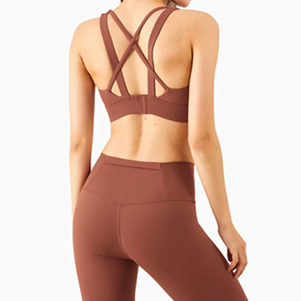 ชุดโยคะสองชิ้นสำหรับผู้หญิงเลกกิ้งสปอร์ตบราเอวสูงมีโลโก้ด้านหน้าระบายอากาศได้