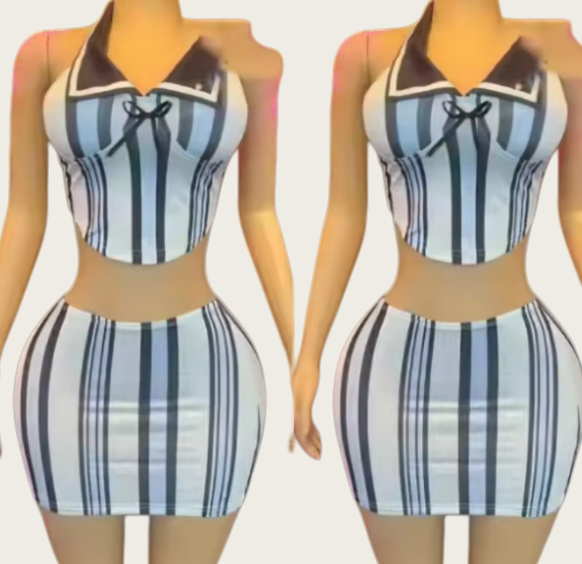 ชุดเซ็ต 2 ชิ้น Viviblook Z401ST02 ลายพิมพ์ดิจิทัลแบบใหม่ เสื้อสายเดี่ยวคอ halter กระโปรงมินิสเกิร์ตลายทาง สไตล์ Y2k