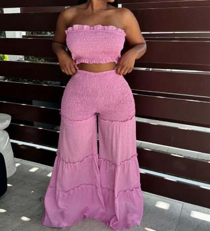 วิวิบลุค Z507ST08 ชุดเซ็ตสองชิ้นสำหรับผู้หญิง เสื้อครอปสายเดี่ยวแต่งระบายแบบเซ็กซี่สำหรับฤดูร้อน และกางเกงขายาวทรงกระบอก