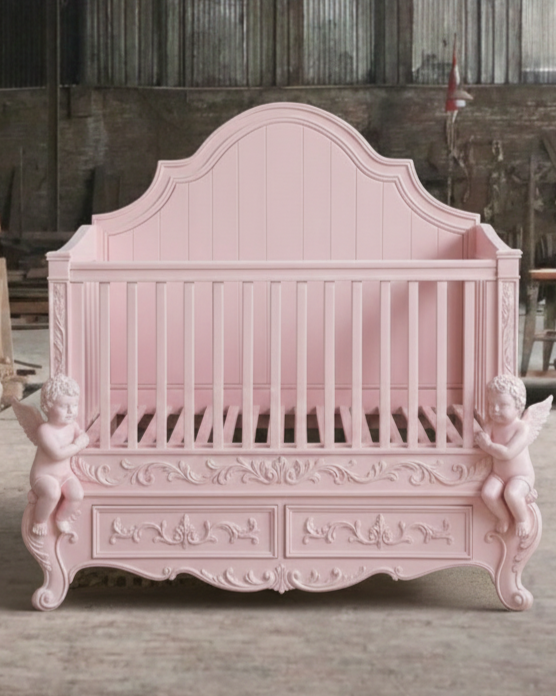 เตียงเด็กอ่อนแกะสลักด้วยมือ CV DAABADI FURNICO INDONESIA ทำจากไม้มะฮอกกานีแท้พร้อมแผ่นไม้อัด ดีไซน์ทนทาน สีชมพู