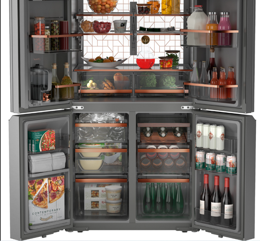 คาเฟ่ 36 อิน วัตต์ 28.3 คิว ตู้เย็นสเตนเลสสตีลแบบประตูสี่บาน ช่องแช่แข็งด้านล่าง ยี่ห้อ Ft. Smart พร้อมระบบจ่ายน้ำอัตโนมัติแบบสองหัวจ่าย เหมาะสำหรับรถยนต์และโรงแรม