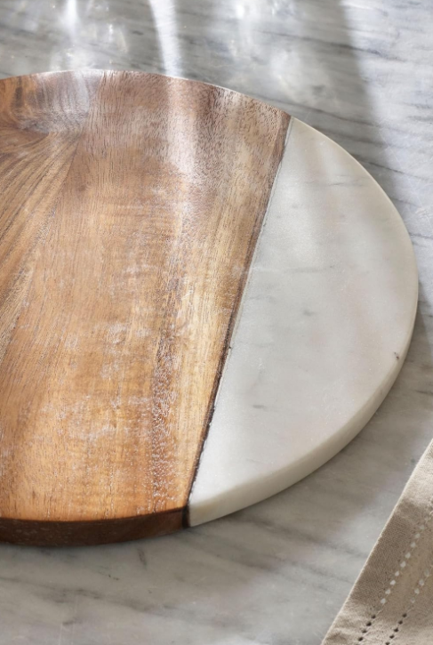เขียงทำเค้กทำด้วยมือหินอ่อนสีขาวและไม้รูปทรงกลมสำหรับใช้ในครัวบ้านผักผลไม้พิซซ่าเนื้อชีสเขียง