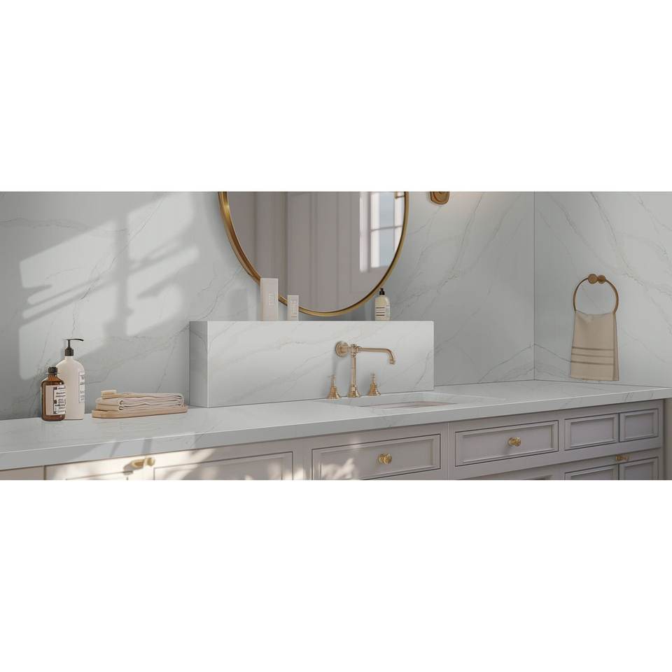 แผ่นควอตซ์คริสตัล Calacatta Safyra พรีเมียม ขนาดใหญ่ กันน้ำ ทนทาน ดีไซน์ทันสมัย