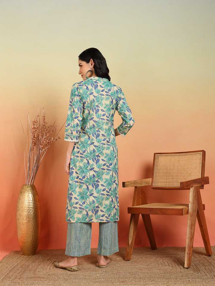 Calf Length Straight Kurta Pant Set In Green Featuring Cotton Flex Fabric Mandarin Collar Floral Print And Mirror Work For Women