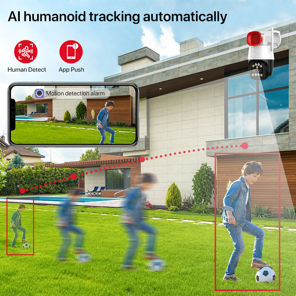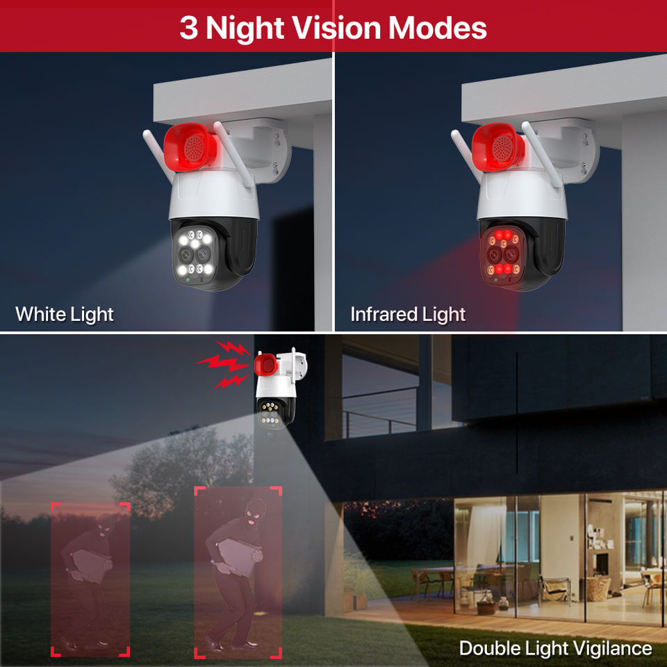 มนุษย์การติดตามการเคลื่อนไหว, ในตอนกลางคืน, การตรวจจับการเคลื่อนไหว, กันน้ำ / ฝนและแดด, Built-in ไซเรน, PAN-TILT, 2-Way Audio