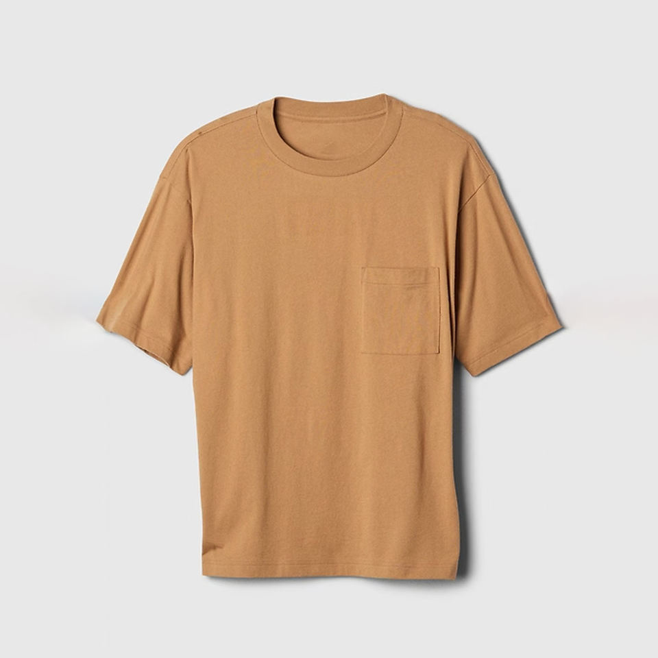 เสื้อยืดแขนสั้นถักนิตติ้งสีน้ำตาลอูฐ ผ้าฝ้าย 100% เนื้อนุ่ม ทรงหลวม กระเป๋าเสื้อข้างเดียว กันยับ แห้งเร็ว ใส่ได้ทุกวัน