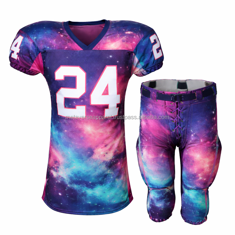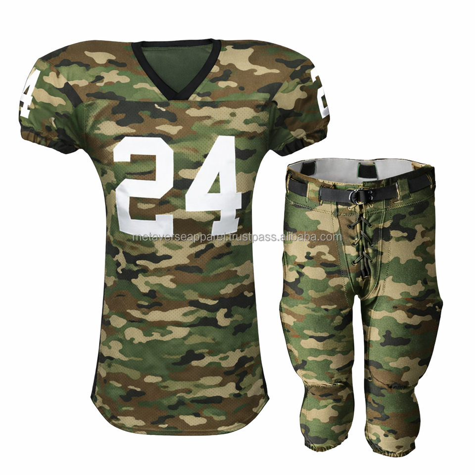 ชุดยูนิฟอร์มอเมริกันฟุตบอลลายพราง ดีไซน์แบบอเมริกัน MOQ ต่ำ โรงงานผลิตโดยตรง รับทำตัวอย่าง ออกแบบเองได้ พิมพ์ลายด้วยความร้อน ชุดทีมแขนสั้น