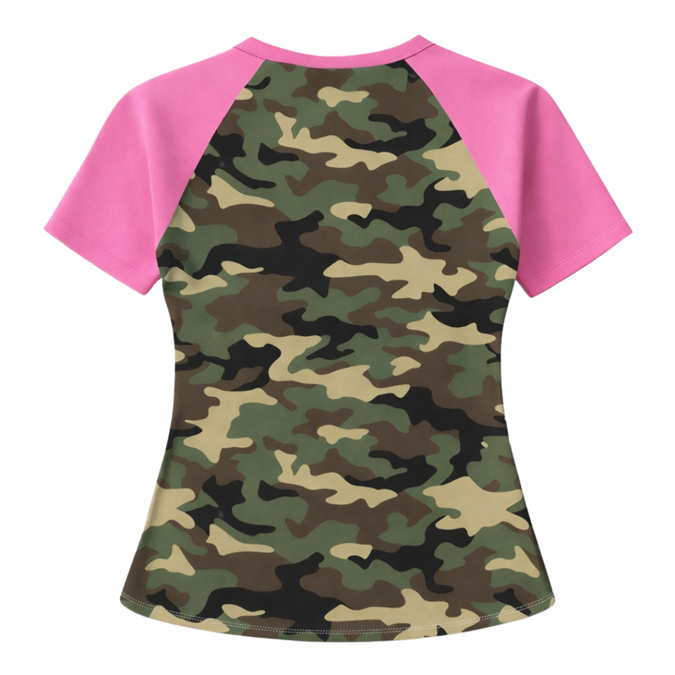 เสื้อยืดแขนแร็กแลนลายพรางสำหรับสาวๆ ชุดนักเรียนหญิงสีชมพูและสีเขียว สไตล์นักศึกษาหญิง ชุดนักเรียนหญิงแบบกรีกที่มีสไตล์
