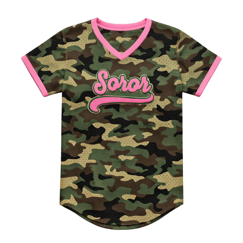 เสื้อเบสบอลลายพรางของกลุ่มสตรีนักศึกษากรีก สีชมพูและสีเขียว สไตล์ลำลองทันสมัยสำหรับนักศึกษาหญิง