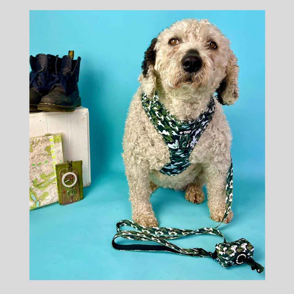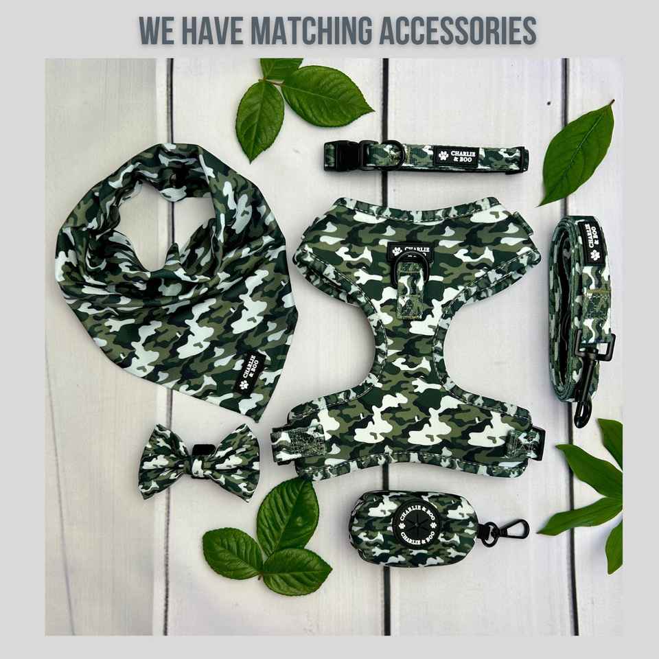 สายรัดสุนัขแบบปรับได้สีเขียวลายพรางตามสั่งผลิตภัณฑ์สำหรับสัตว์เลี้ยงที่ปรับได้คุณสมบัติส่วนบุคคลทำจากหนังโพลีเอสเตอร์ไนล่อนสีทึบหมุดสุดเก๋