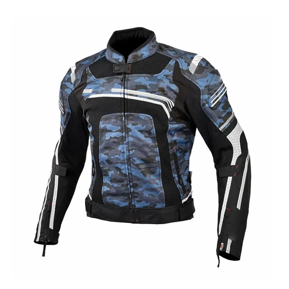 แจ็กเก็ตขี่มอเตอร์ไซค์ลายพรางสีน้ำเงินอุปกรณ์สำหรับขับขี่ลายพรางและตาข่ายสีดำมีแถบสะท้อนแสงและแผ่นป้องกันสำหรับนักปั่นจักรยาน