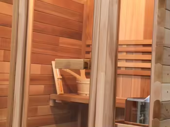 ห้องซาวน่าแบบอินฟาเรดภายในแบบมีเฮมล็อคพร้อมประตูหน้าและแผงทำความร้อนต่ำ