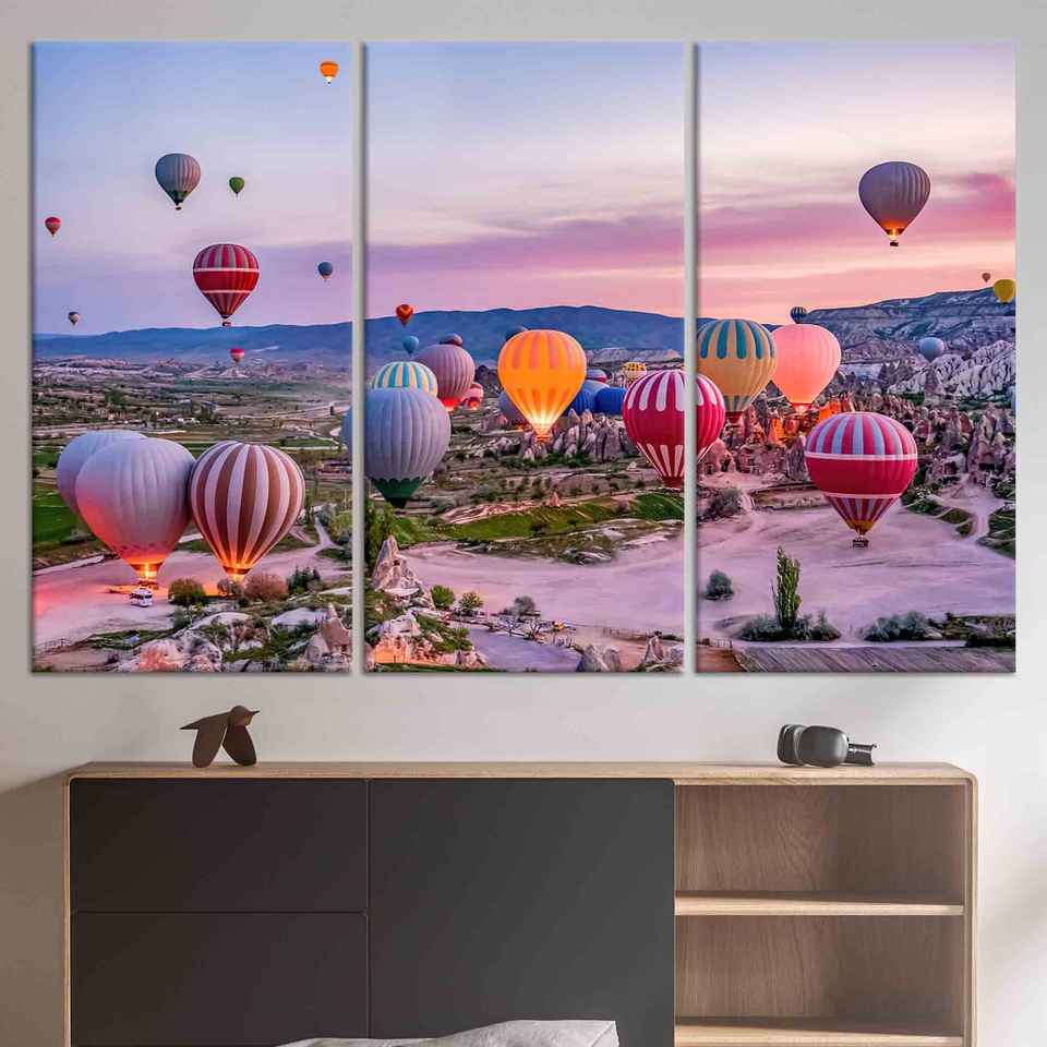 ภาพพิมพ์บนผ้าใบกันน้ำลายพระอาทิตย์ขึ้นที่คาปปาโดเกีย - ภาพพิมพ์ทิวทัศน์โกเรเม่ ชุดผ้าใบ 3 ชิ้น