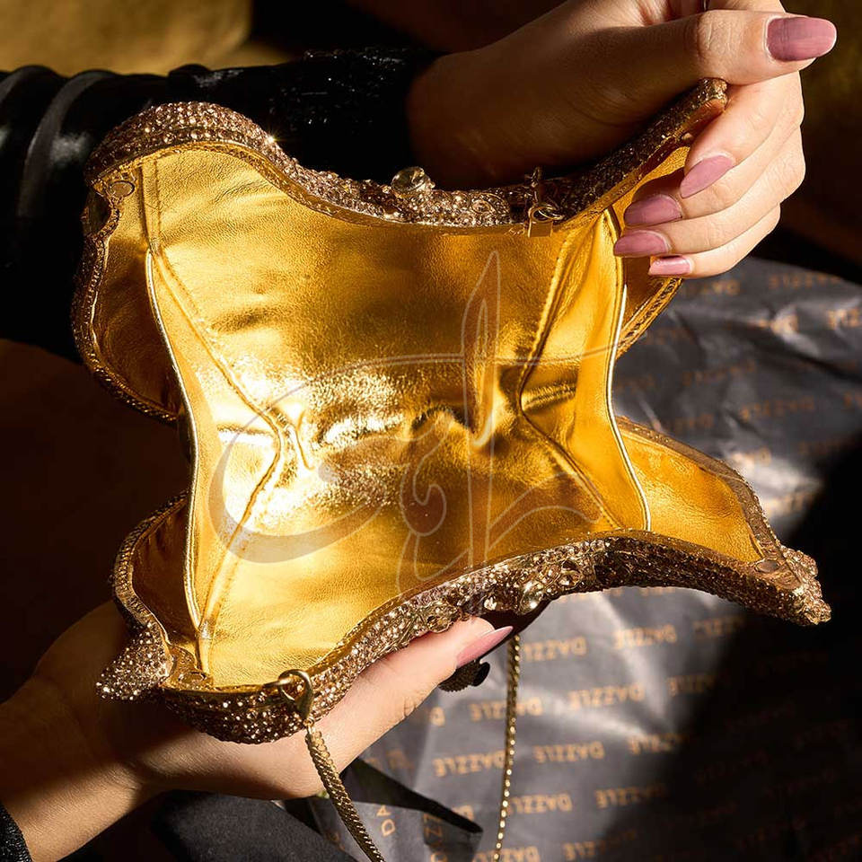 กระเป๋าคลัทช์ผู้หญิงดีไซน์หรูหรา โดดเด่นด้วยโครงเหล็กที่ได้แรงบันดาลใจจากนก ประดับด้วยเพชรหลากสีสัน พร้อมกระดุมแฟชั่น เหมาะสำหรับงานกลางคืน