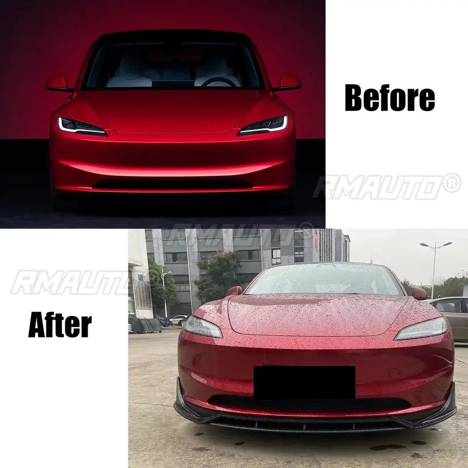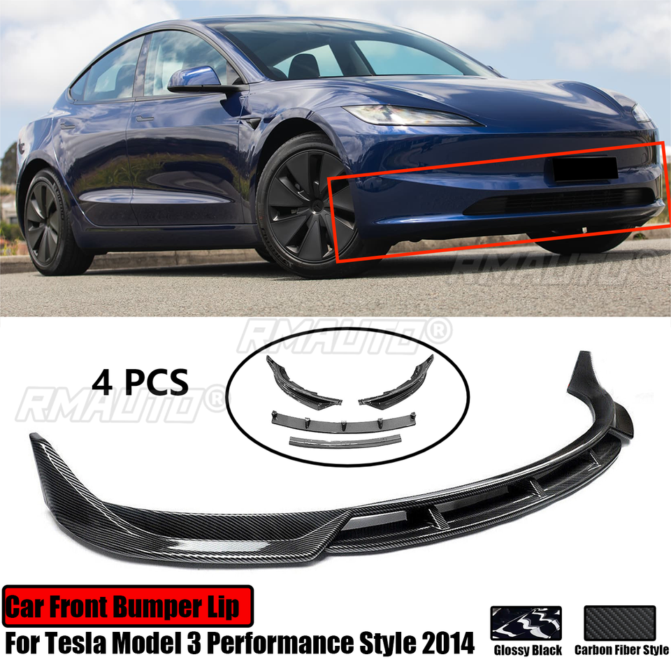 ลิ้นกันชนหน้ารถยนต์สำหรับ Tesla Model 3 Performance Style 2024 ดิฟฟิวเซอร์ สปลิตเตอร์ สปอยเลอร์ ป้องกันรอยขีดข่วน สีดำเงา ลายคาร์บอนไฟเบอร์