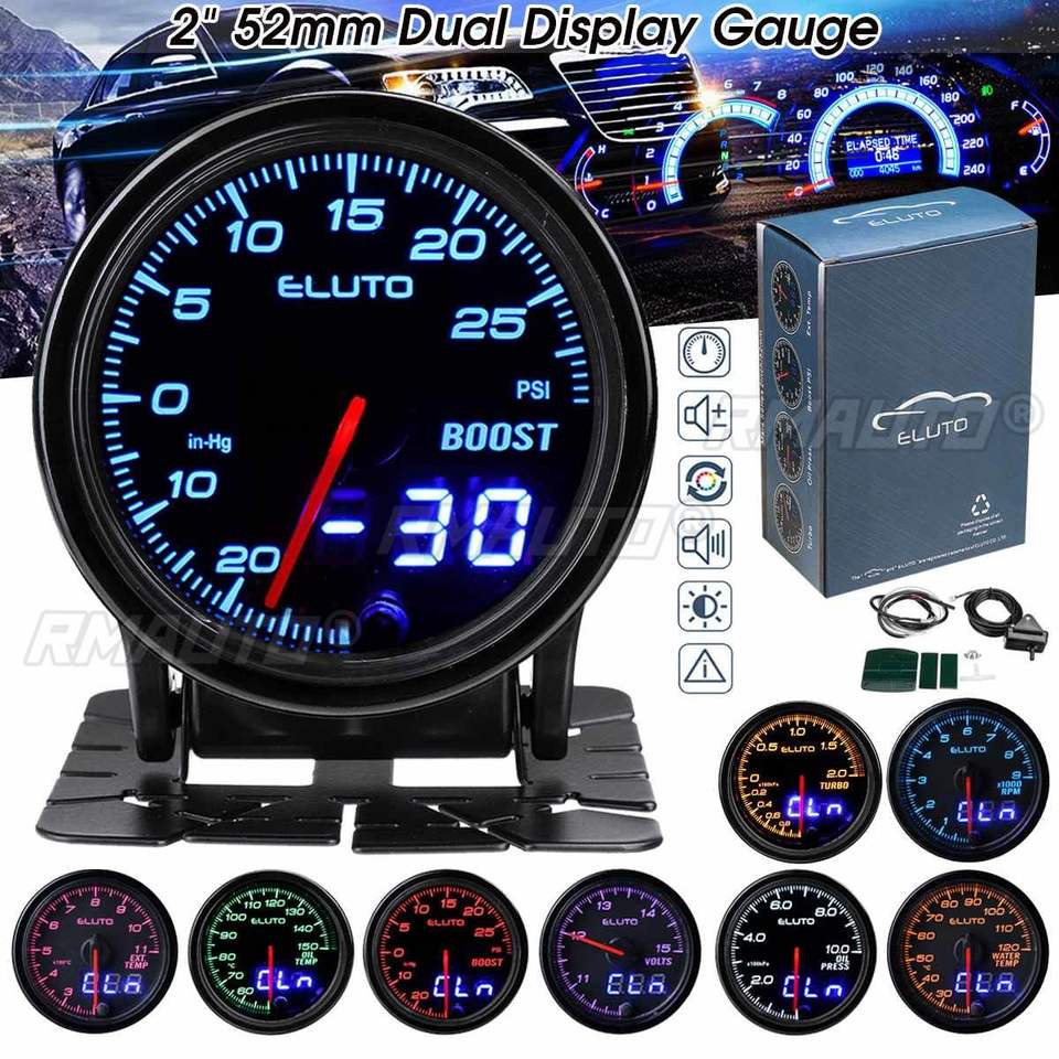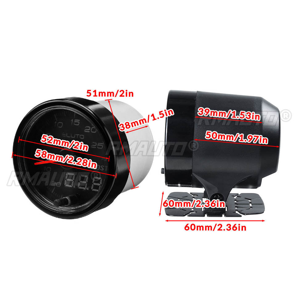 เกจวัดรถยนต์ ขนาด 52 มม. วัดแรงดันเทอร์โบบูสท์ (Psi) วัดแรงดันน้ำมัน วัดอุณหภูมิน้ำมัน วัดแรงดันน้ำมันเครื่อง วัดอุณหภูมิน้ำ วัดแรงดันไฟฟ้า วัดรอบเครื่องยนต์ (RPM) พร้อมไฟเตือน