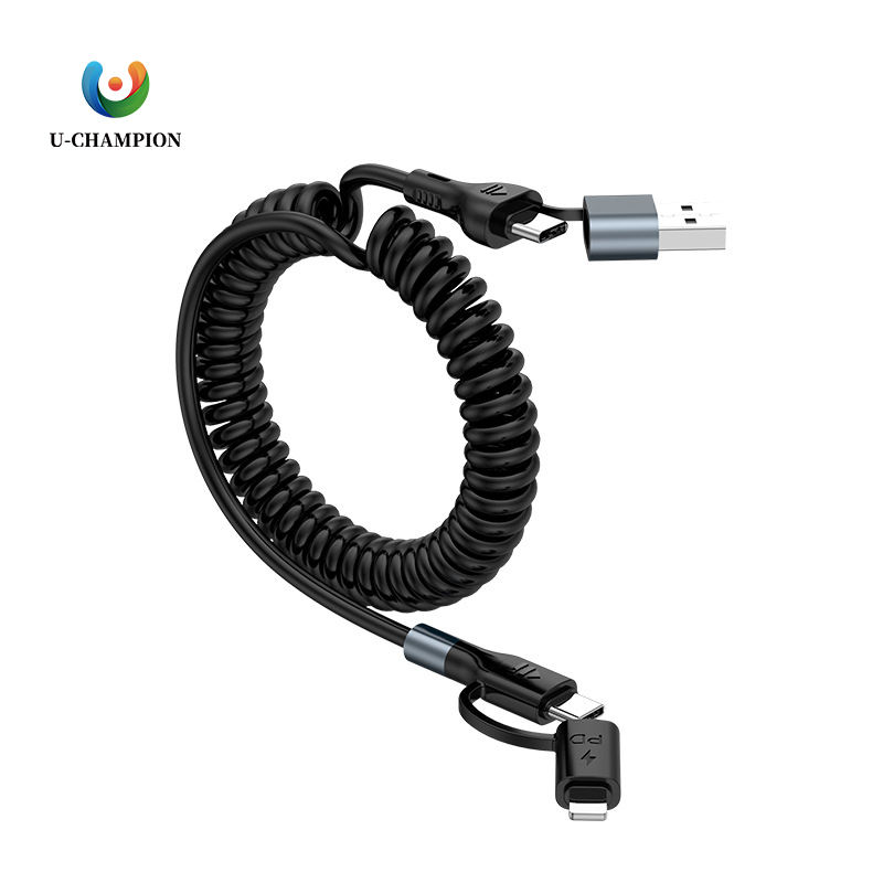 สายดาต้า USB เป็น C ชนิดสปริงสำหรับรถยนต์ PD 90องศาสายชาร์จโทรศัพท์ TPU สำหรับ iPhone และ Samsung