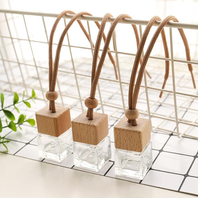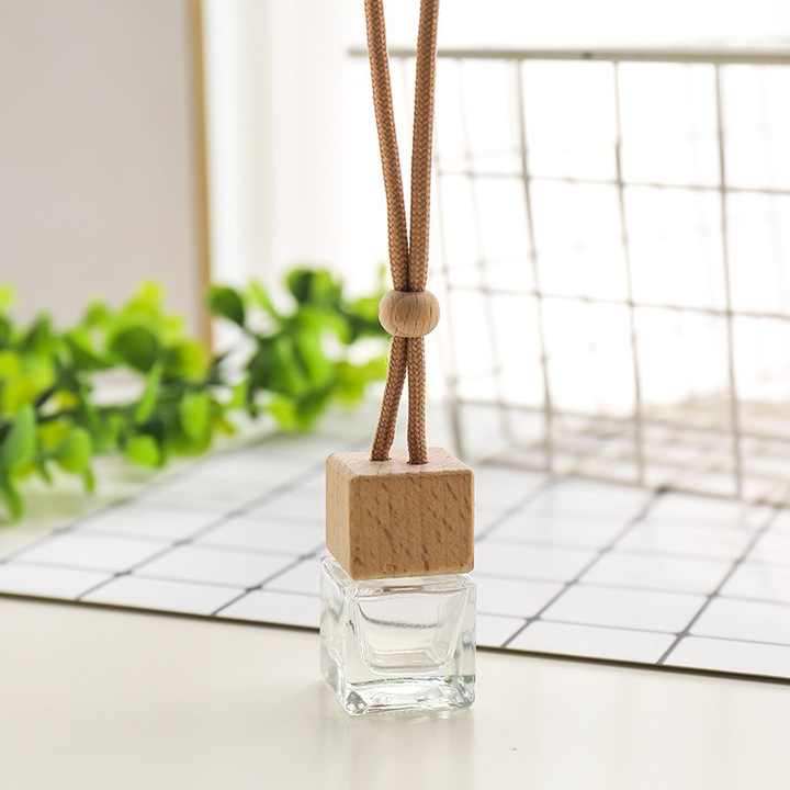 น้ำหอมปรับอากาศในรถยนต์แบบจี้ห้อย ฝาไม้ ขวดแก้ว กลิ่นหอมกระจายในรถยนต์ ขวดน้ำหอมแก้วทรงสี่เหลี่ยมสำหรับรถยนต์