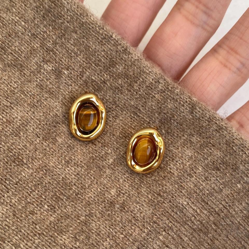 ต่างหูทรงรีประดับหินตาเสือ สไตล์เมลาร์ด ย้อนยุค ฤดูใบไม้ร่วง/ฤดูหนาว ทำจากเงินแท้ S925 รุ่นคาราเมลเชสต์เน็ต แฟชั่น