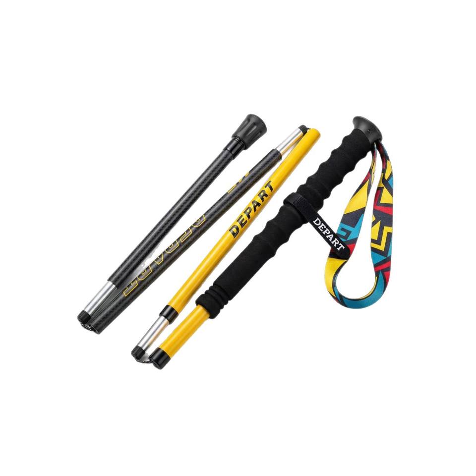 ไม้เท้าเดินป่าแบบพับได้ทำจากคาร์บอนไฟเบอร์ ปรับความยาวได้ 3 ท่อน ปลายยางสีเหลือง สำหรับการผจญภัยกลางแจ้ง