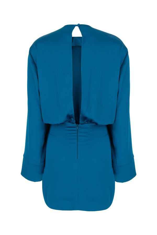 ชุดเดรสแขนยาวสำหรับผู้หญิงชุดเดรสสั้นสีเขียวหัวเป็ดหลังยาวแบบแยกออก