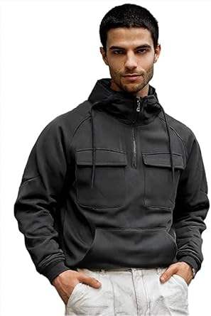 เสื้อฮู้ดคาร์โก้สำหรับผู้ชาย เสื้อสเวตเชิ้ตแบบมีซิป ¼ เสื้อฮู้ดคาร์โก้แบบสวมหัวสำหรับออกกำลังกาย เสื้อฮู้ดแฟชั่นผู้ชายสำหรับกิจกรรมกลางแจ้ง