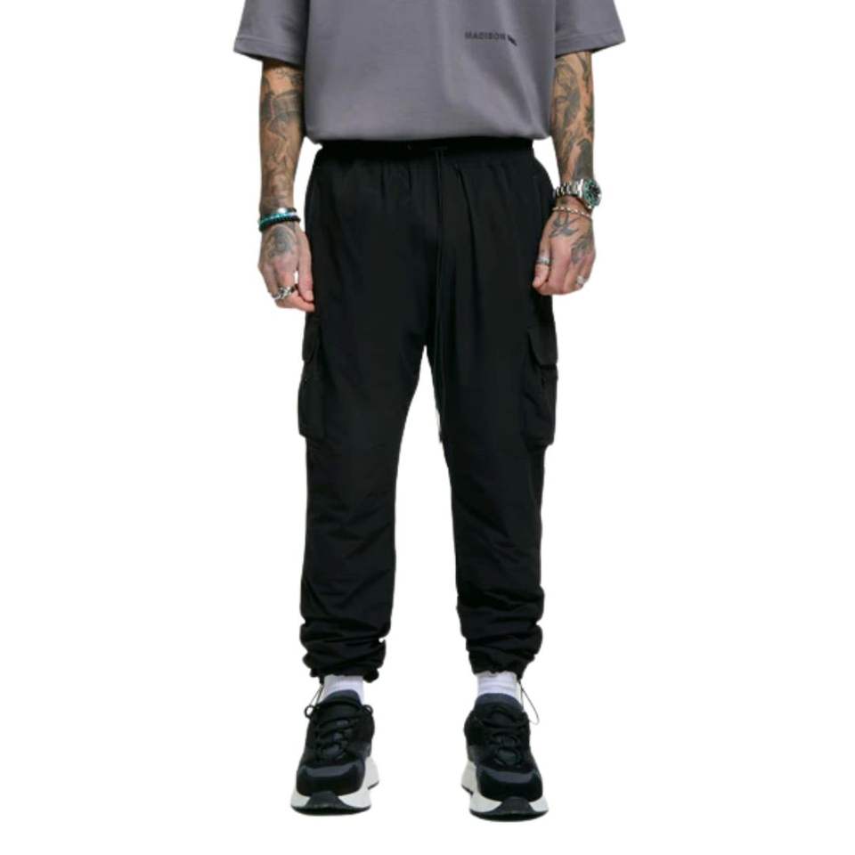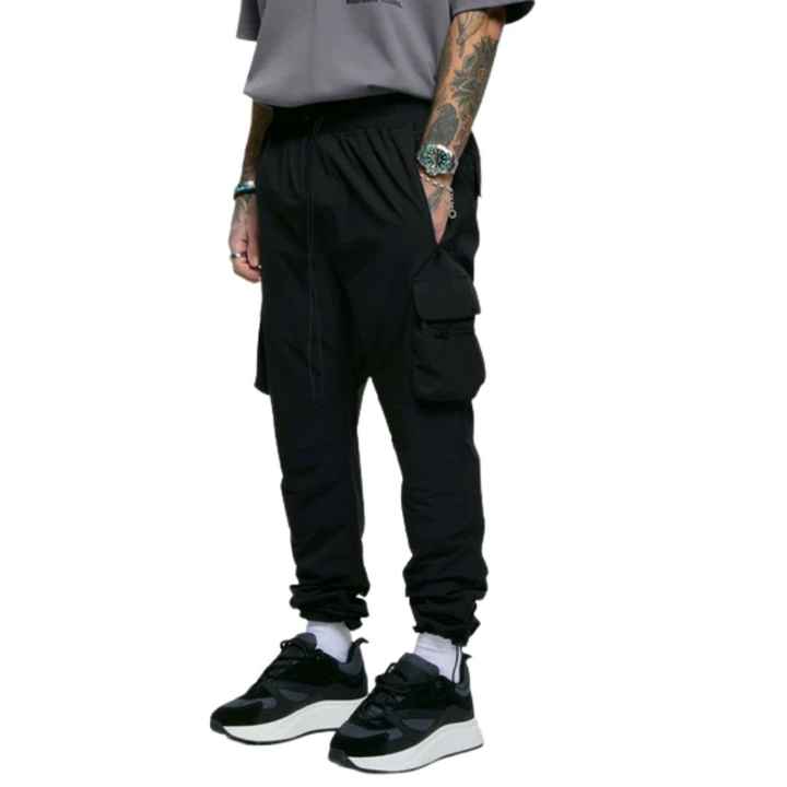 กางเกงคาร์โก้สีดำสไตล์โมเดิร์นสตรีทแวร์ผ้าพันข้อเท้าปรับได้เอวผ้ายืดหยุ่นทนทานซ่อนซิปกระเป๋าพอดีมีสไตล์